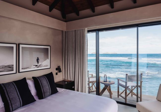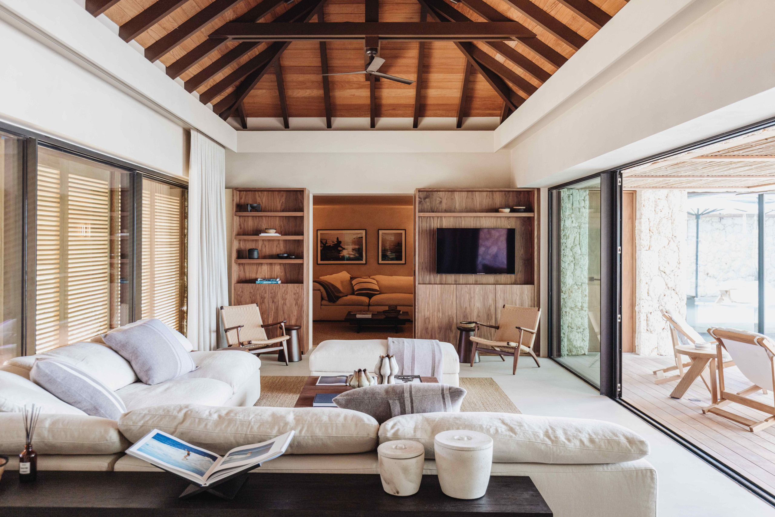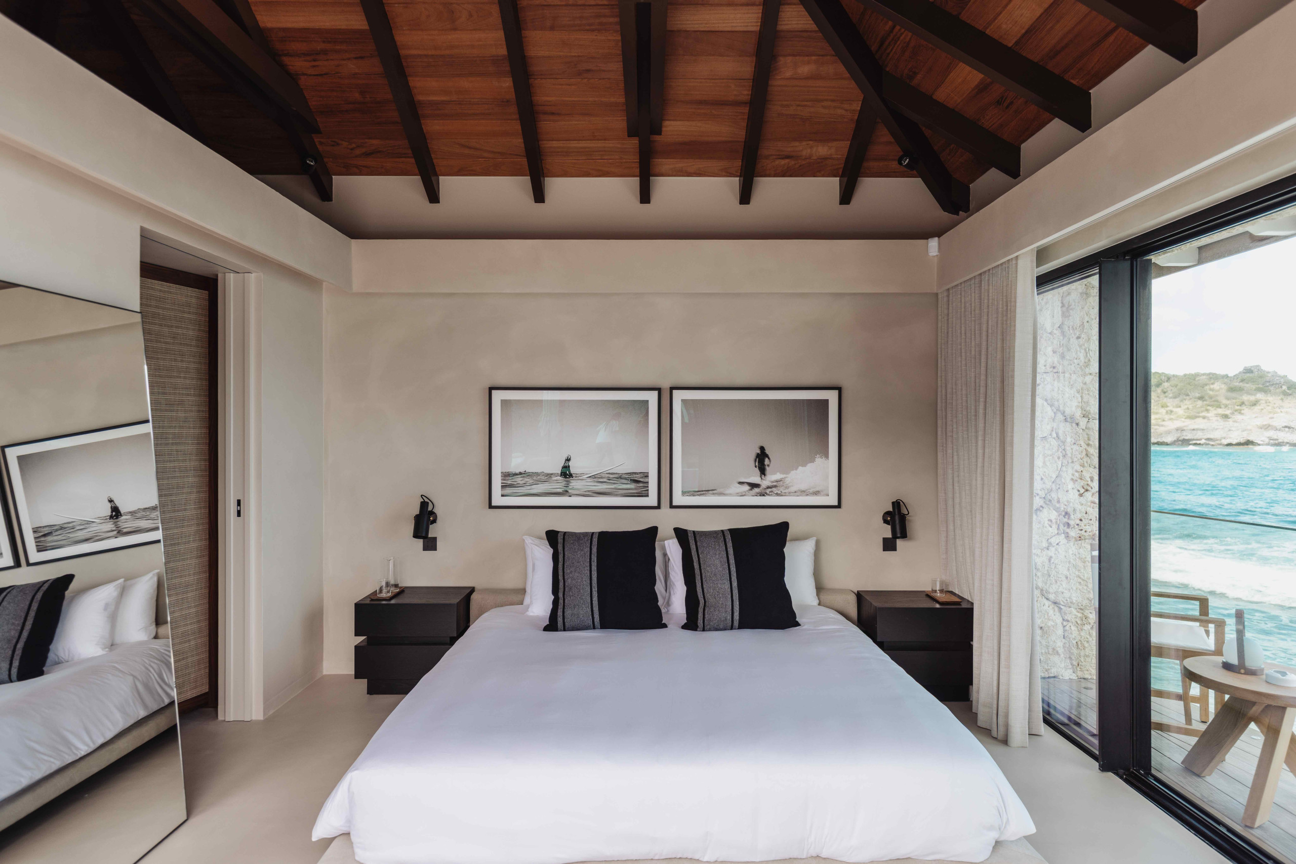 A l’intérieur, le salon est pourvu de larges canapés, jouxtant la cuisine blanche, en pierre, où il est aussi possible de prendre ses repas sur un îlot central. Les chambre, très chaleureuses, sont particulièrement soignées, en particulier celle pourvue de baies en angle qui offre une vue à 180 degrés sur l’eau turquoise, comme les salles de bain, spacieuses et modernes.