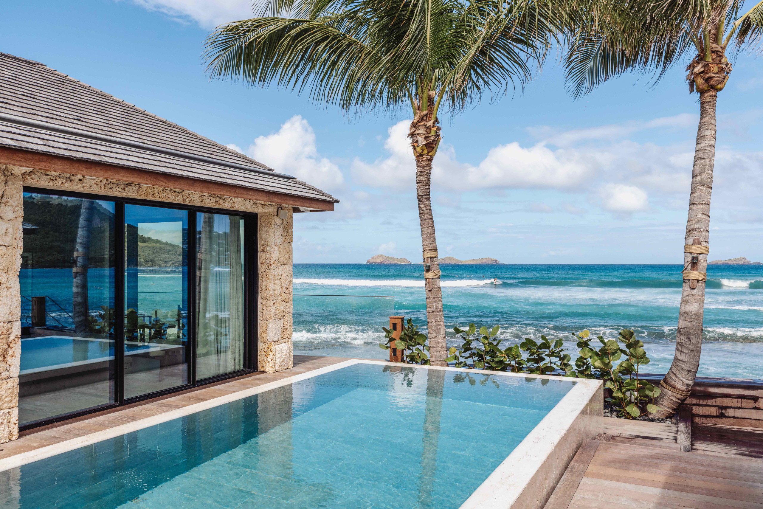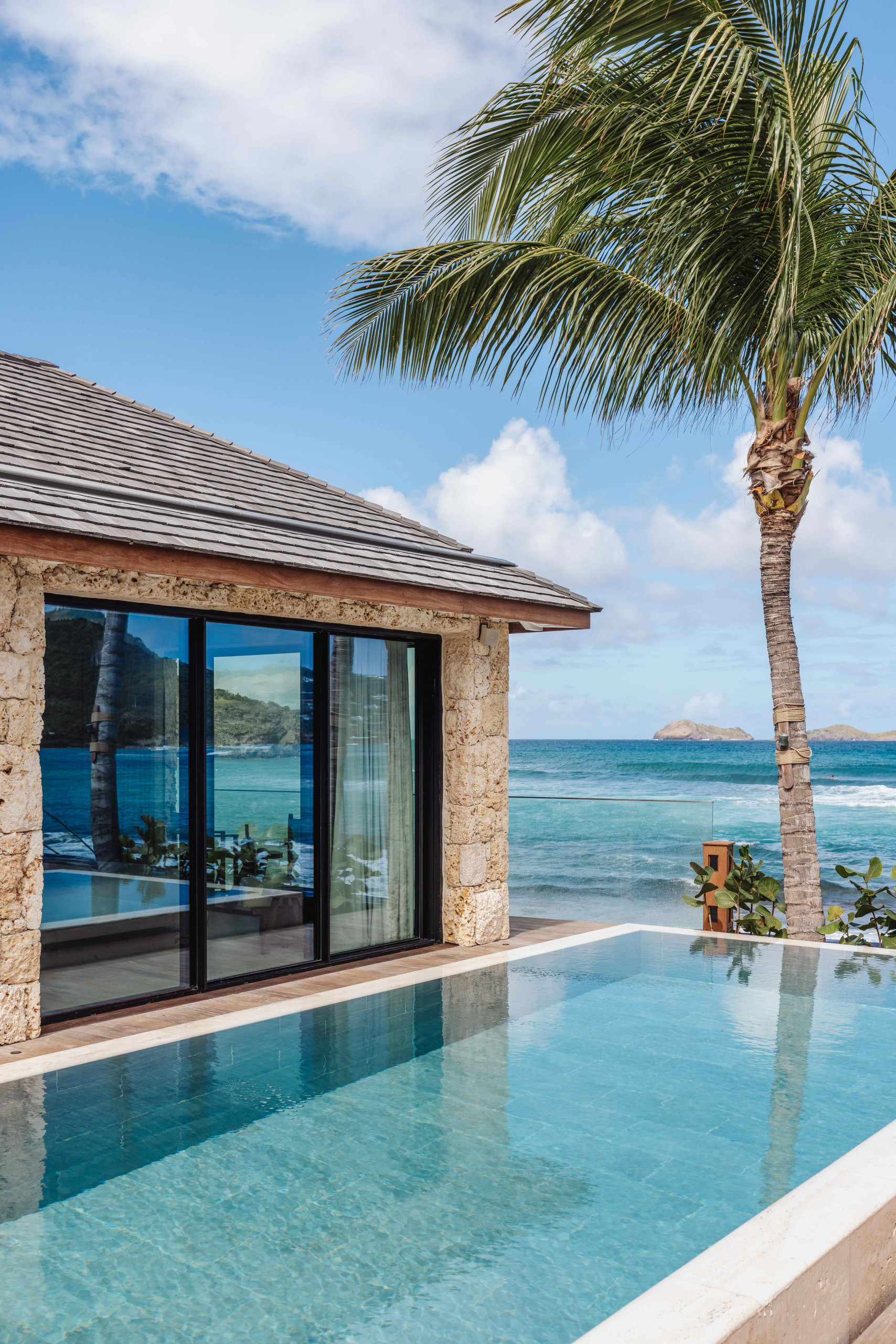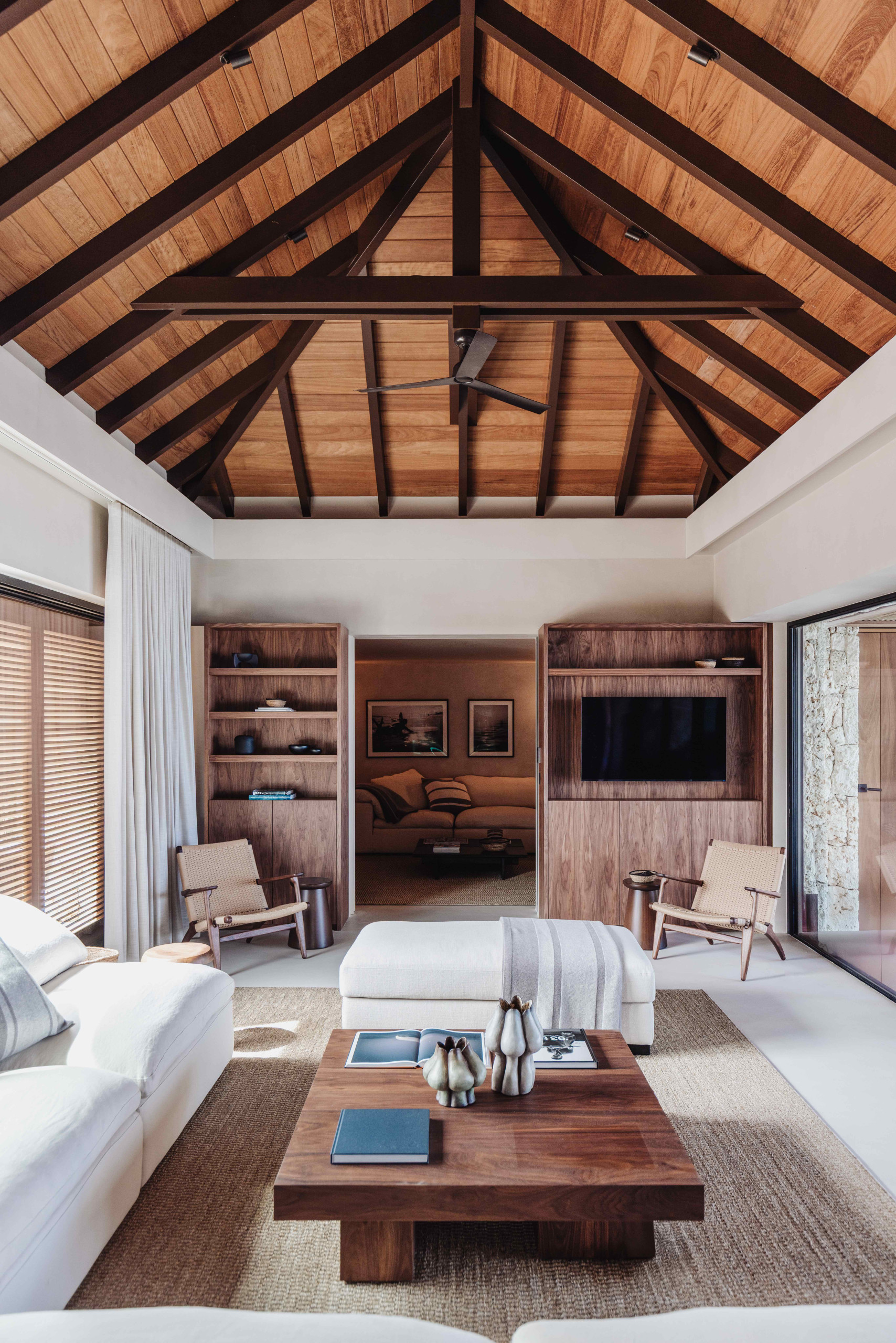 Une magnifique porte en bois ouvragée invite à entrer dans cette maison tout en bois à la lumière traversante, meublée dans les tons de crème, de beige et de bleu. Un couloir de nage entouré de transats face à la mer, en contrebas duquel se niche une deuxième petite terrasse meublée de banquettes toutes proches de la plage et de son sable blanc, un bar et une longue table en bois pour prendre les repas à l’extérieur.