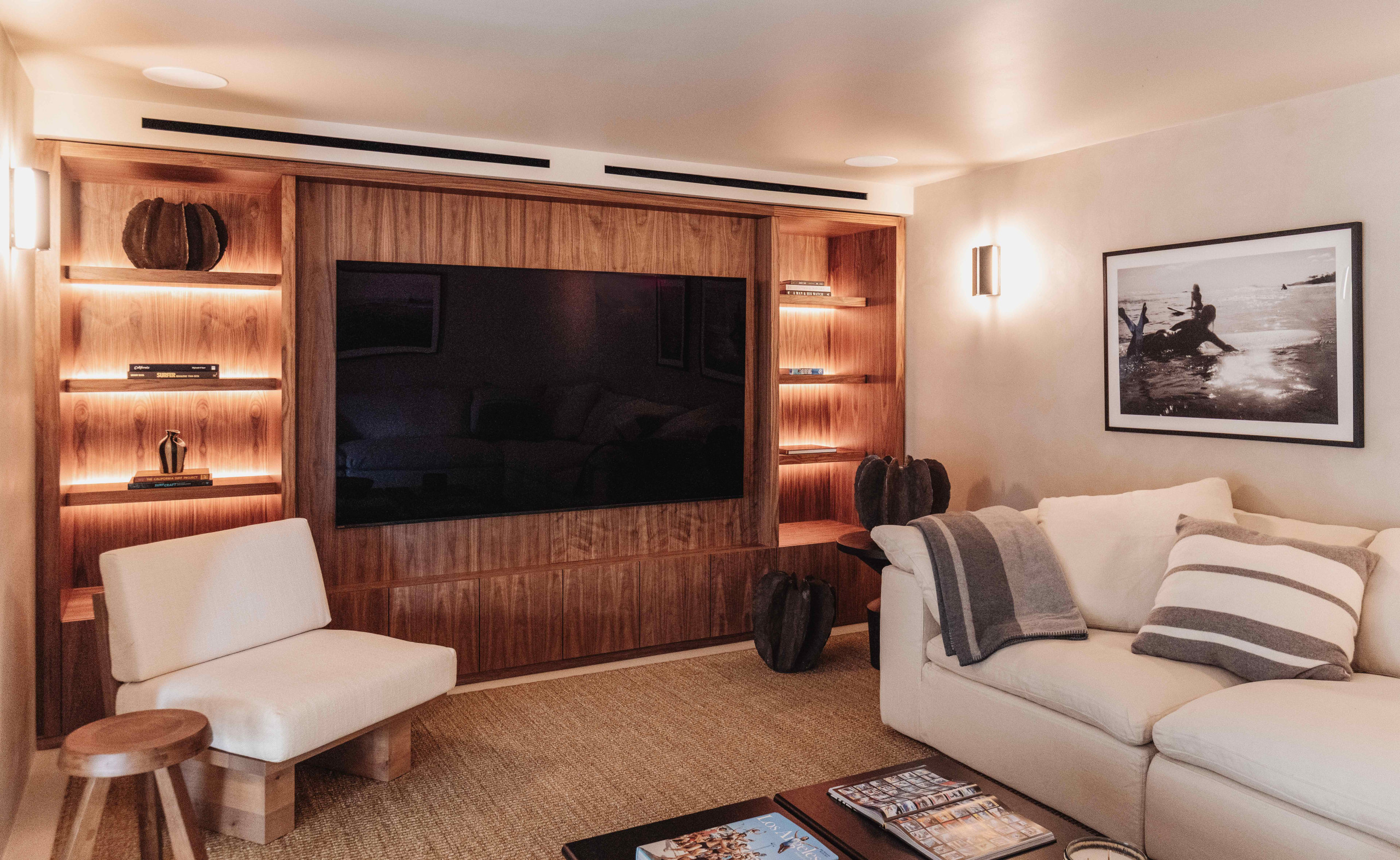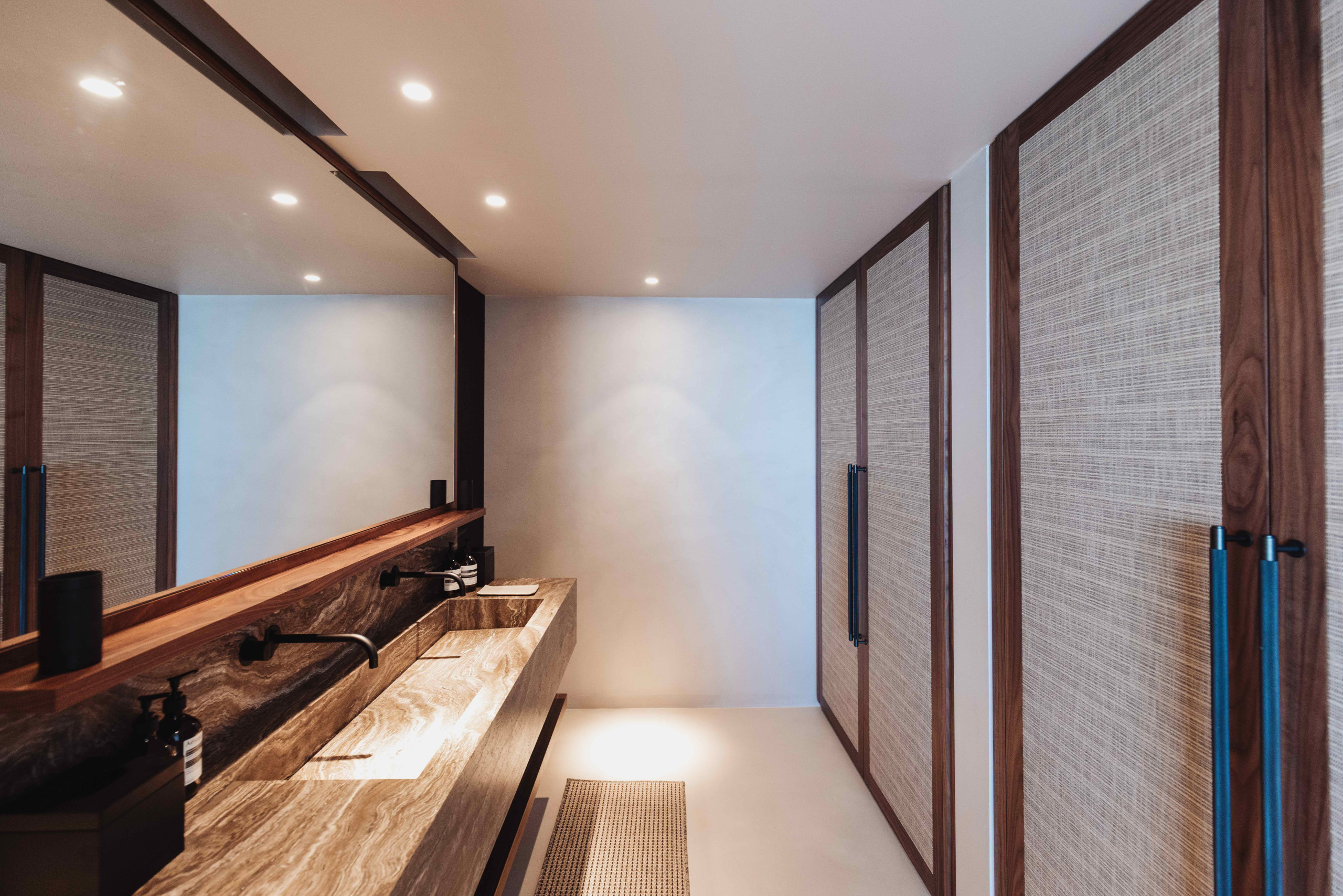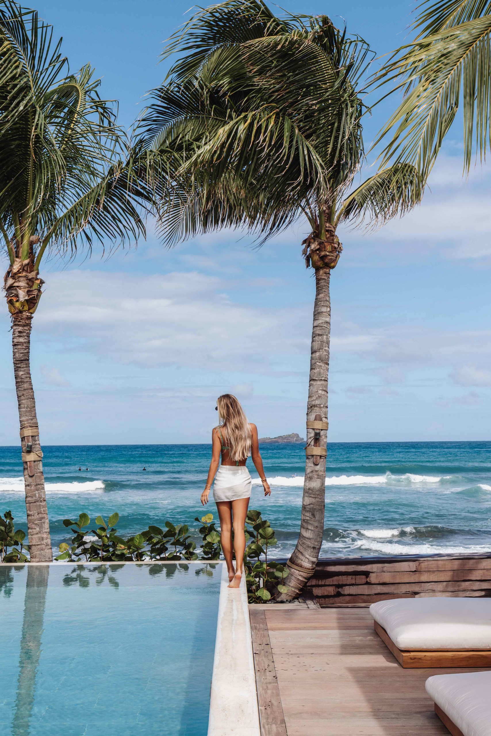 Une magnifique porte en bois ouvragée invite à entrer dans cette maison tout en bois à la lumière traversante, meublée dans les tons de crème, de beige et de bleu. Un couloir de nage entouré de transats face à la mer, en contrebas duquel se niche une deuxième petite terrasse meublée de banquettes toutes proches de la plage et de son sable blanc, un bar et une longue table en bois pour prendre les repas à l’extérieur.